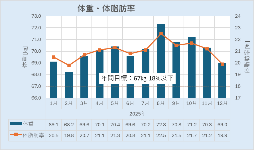 最終的に69.0kg(体脂肪19.9%)。先月よりだいぶ減っているのですが、年末に下痢しまくったのが理由ですね(汚い話ですみません)。そもそも、年間目標であった67kgには届かず。歩くだけではなく、運動をしなければ痩せないというのが実感です。2026年はどうしようか。。。体形を維持できているだけでも良しとするか。