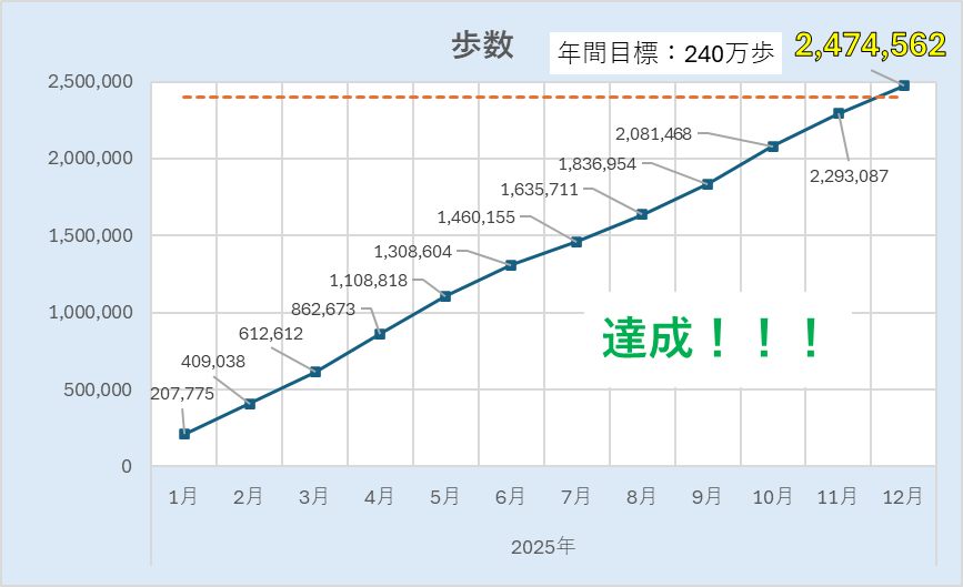 とはいえ、年間240万歩の目標は達成できたので、結果オーライです。