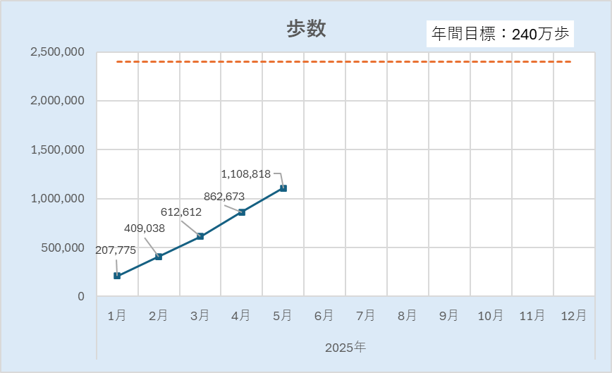 月20万歩のペースに対して10万歩も余裕がありますが、これから暑い季節になり、朝の通勤はバスを使うなど歩かなくなるため(健康第一)、余裕はあるのか?