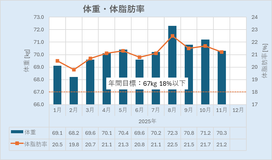 70.3kg(体脂肪21.2%)で先月より少し減りました。すでに目標達成は諦めましたが、せめて今年の始めくらいの状態を維持できたという結果にはしたいですね。