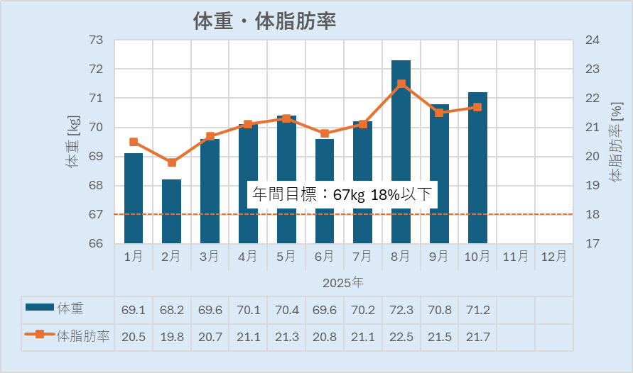 71.2kg(体脂肪21.7%)で先月より0.4g増えましたが。9月と比較して誤差範囲という気もしますが、体重を減らす積極的な行動をしていないのでこのままだと目標達成どころか開始時点より増えそうです。