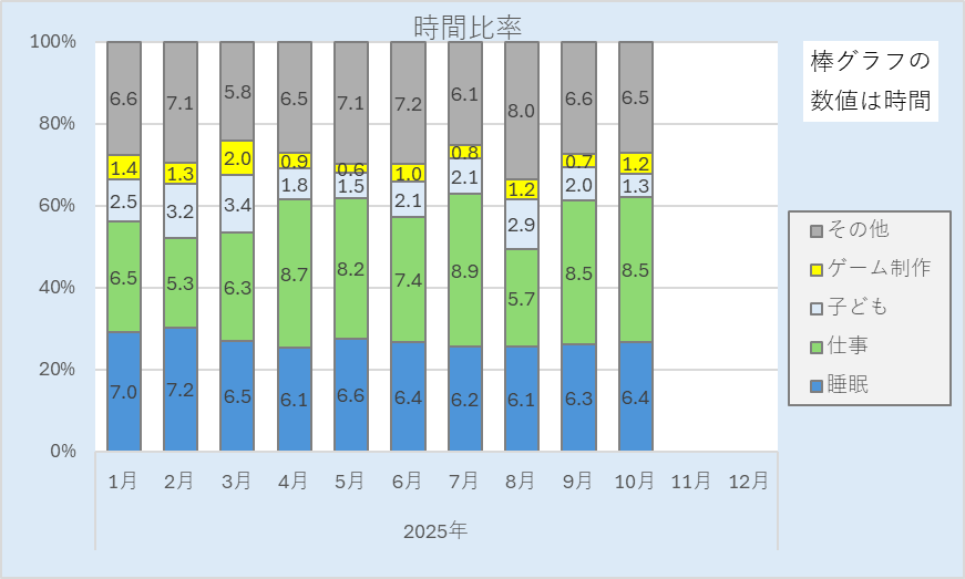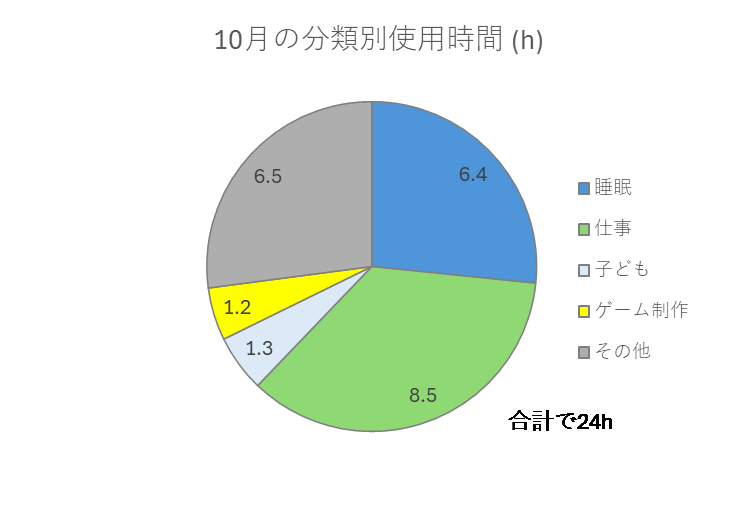 ゲーム制作時間を平均1時間以上取れたのが良かったです。その理由として、子ども(3歳)に手がかからなくなってきた(ほんの少しですが)ことが挙げられます。夜の寝かしつけ時に暴れず、短時間で寝てくれるようになったので、寝る前に少しゲーム制作をすることができました。その辺は↓の過去との時間比率の比較グラフにも表れていますね。