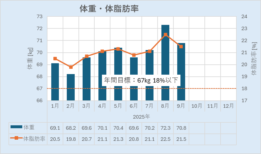 70.8kg(体脂肪21.5%)で先月より1.5kg減りました。8月は暴飲暴食が過ぎましたね。9月は通常の食生活に戻ったことが理由だと思います。