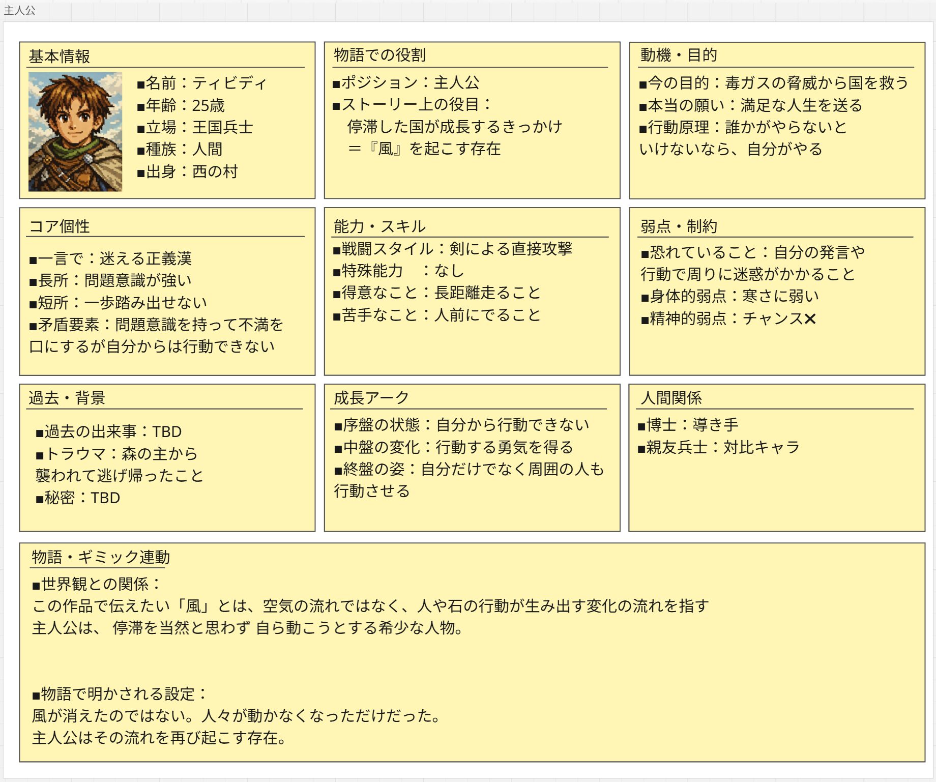 キャラ設定って難しく、そして奥が深い。最後は作者が持っていきたい物語に都合いいように性格や背景を決めることになると思いますが、それだとそのキャラへの感情移入が弱まる。キャラ主導で考えたとしても作者視点であって、遊ぶ人の状況によって感じ方は変わるはず。適度な余白も大切か…とか自問自答しながら、とりあえず ちゃっぴーに教えてもらったフォーマットで主人公を書いてみました。