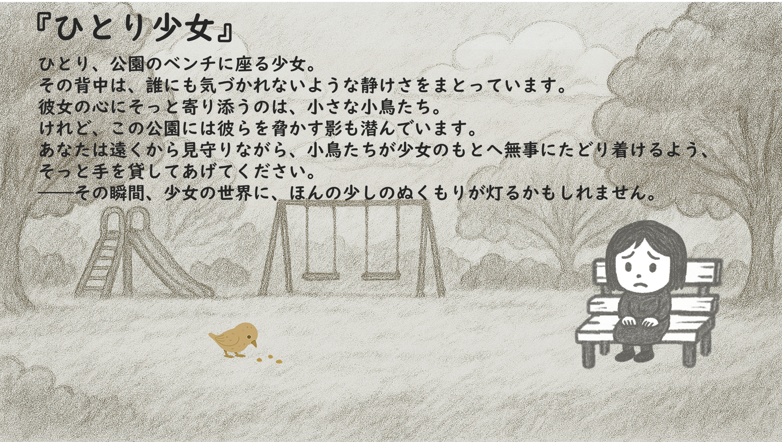 今回は、5作目として公開した『ひとり少女~One Girl~』を紹介させてください。説明書的な位置づけになります。どんな感じで作ったのかは別の記事で紹介させていただきたいと思います。