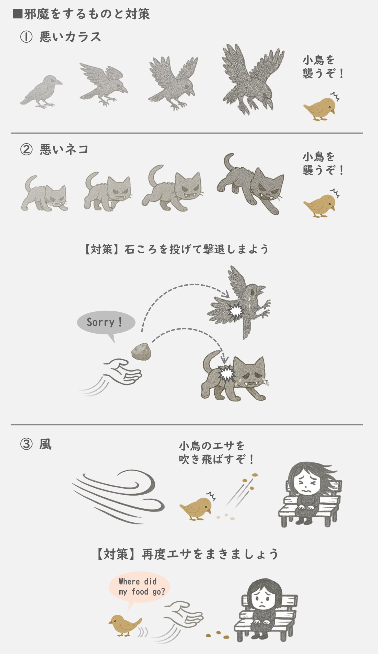 右上から飛んでくるカラスは石を当てづらいです。スピードが速いときは特に。私としては念のため石を2連続で投げて確実に仕留めるようにしています。