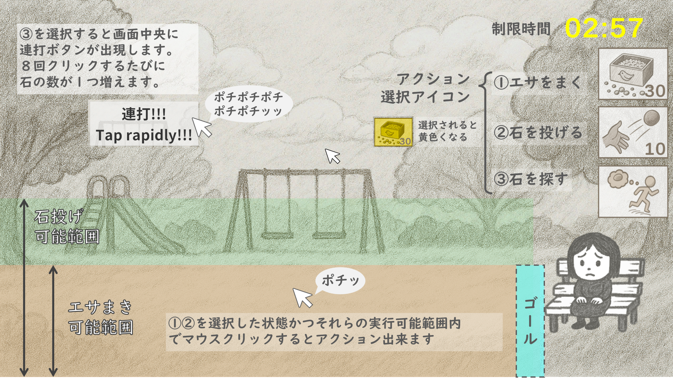 まったくもって簡単なゲームなので、説明がなくても何となくわかってもらえると思います。とはいえ説明をしますと↓の図の通り。